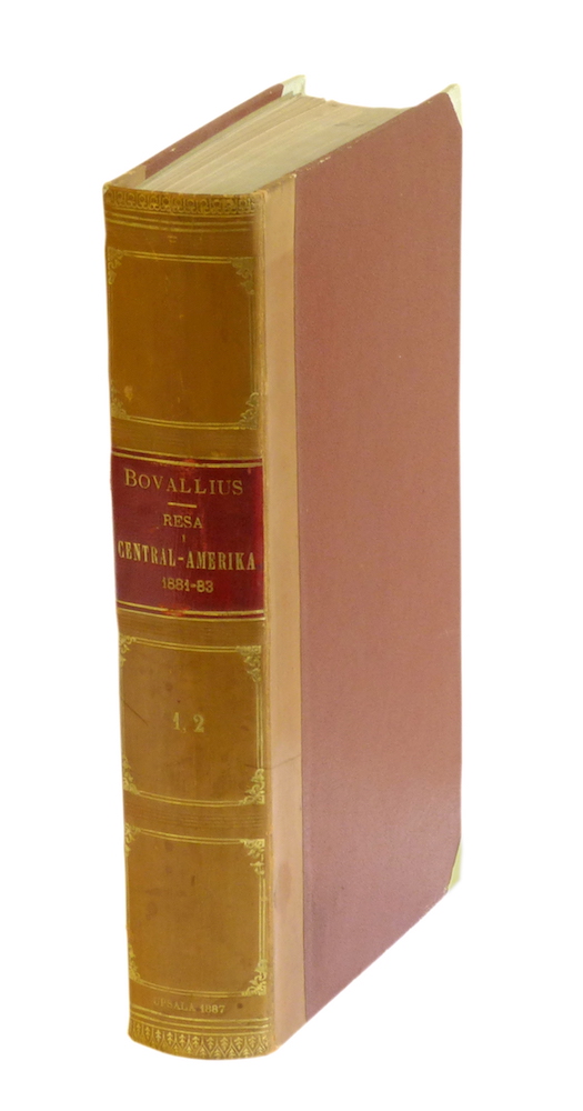 Uppsala, R. Almqvist & J. Wiksell, 1887. 8:o. XII,+ 275 s.+ 12 planscher,+ 3 kartor, varav två utvikbara; XII,+ 277-483 s.+ 7 planscher,+ 3 kartor, varav två utvikbara. Rikt illustrerad med trägravyrer i texten. Samtida ljusbrunt hfrbd, guldornerad rygg, pergamenthörn och med röd titeletikett. Ur Claes Annerstedts bibliotek, med hans namnteckning. Fint exemplar av första upplagan av zoologen, arkeologen m.m. Carl Bovallius (1847-1907) skildring av sin stora resa i Centralamerika. Resan omfattade även Norra Sydamerika och Västindien. De vetenskapliga resultaten publicerade han i “Nicaraguan Antiquities” året innan. Även i reseskildringen återfinns en del om hans utgrävningar och fynd. Kring sekelskiftet företog han vidsträckta resor i Venezuela, Guyana, Brasilien, Västindien och Centralamerika för undersökning av kautschukskogar och 1901 grundade han själv på Trinidad en plantage för odling av kautschuk. Han dog i Brittiska Guyana.