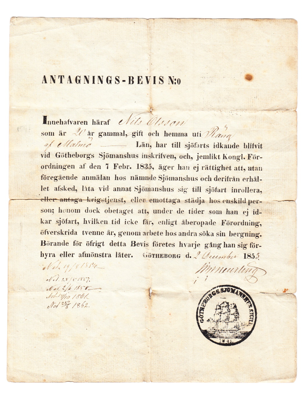 Antagnings-Bevis till Göteborgs Sjömanshus för Nils Olsson 20 år gammal från Räng utanför Malmö.