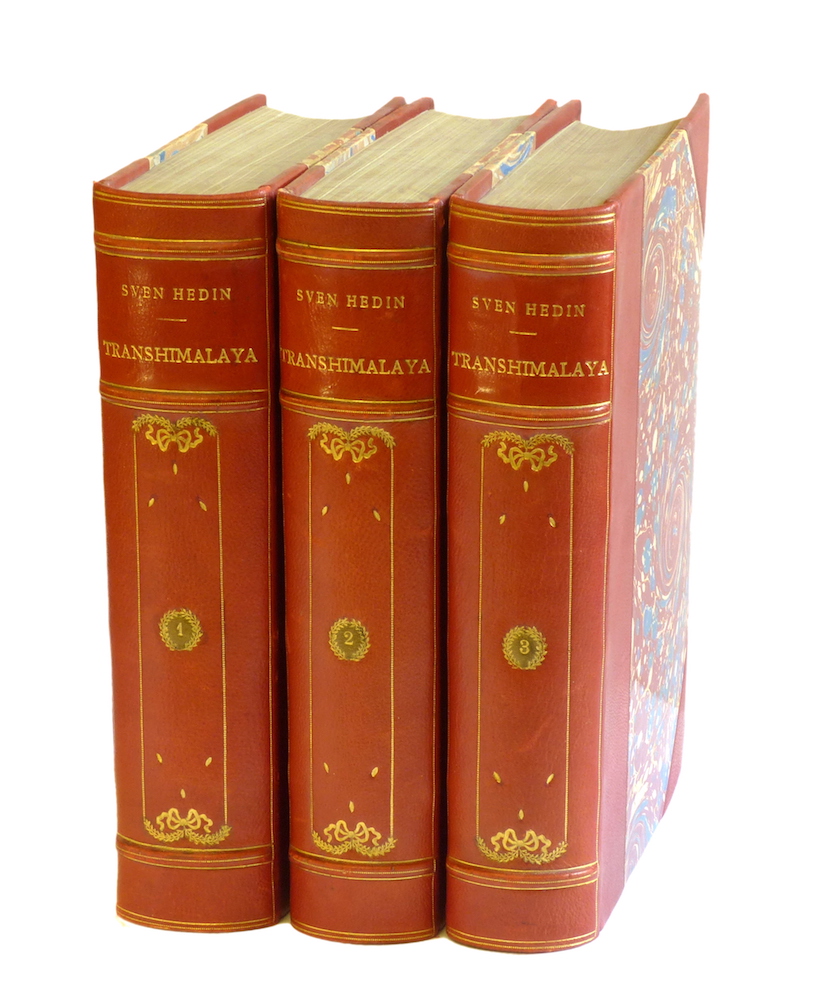 Stockholm, Albert Bonniers förlag, 1909-12. Rikt illustrerad. 8:o. (16),+ 666,+ (2) s.+ 42 planscher,+ utvikbar karta; (4),+ 594,+ (2) s.+ 37 planscher,+ 2 utvikbara kartor; (8),+ 592 s.+ 34 planscher,+ utvikbar karta. Flera planscher utvikbara och kolorerade. Samtida röda halvmarokängband, guldornerade ryggar med tre upphöjda bind och med liten grön deletikett, marmorerade pärmpapper och snitt. Tre volymer. Hess A:7. Fint exemplar av första upplagan av Hedins skildring av sin femte och dittills största resa, åren 1905-08 till Indien och Transhimalaya. Resan dit skildrade han i “Öfver land till Indien”, som utkom 1910. Detta är den reseskildring av Sven Hedin som har översatts till flest språk.