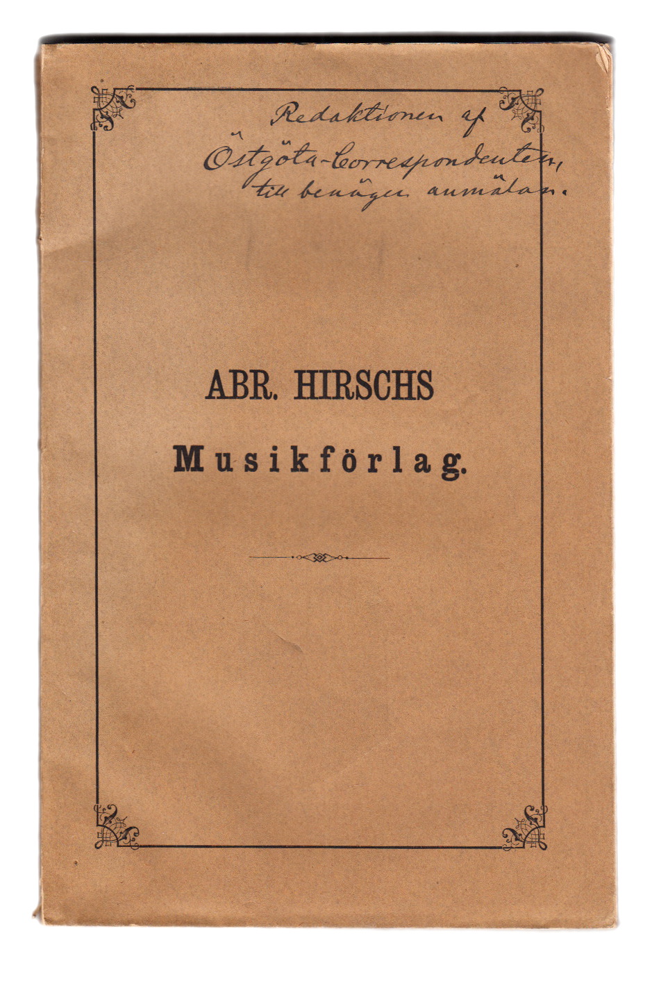Stockholm, Aftonbladets tryckeri, (ca. 1875). 8:o. 172 s. Häftad, med tryckt omslag. Med tillskrift till redaktionen för Östgöta-corresponden med förhoppning om benägen anmälan. Imponerande lagerlista med musikalier utgivna av Abr. Hirsch musikförlag samt med en liten avdelning böcker om musik. Inleds med en lista över förlagets samtliga återförsäljare i Sverige, Norge, Danmark, Finland, Tyskland, Frankrike och Ryssland.