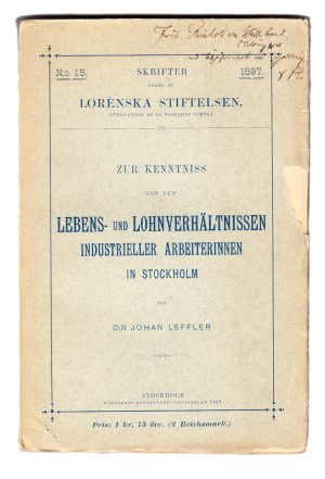 450 krZur Kenntniss von den Lebens- und Lohnverhältnissen Industriellen Arbeiterinnen in Stockholm von D:r Johan Leffler.Stockholm, Kôersners Boktryckeri, 1897. 8:o. 136 s.,+ 13 tabeller, varav två utvikbara. Häftad, med något trasigt omslag. (Skrifter utgifna af Lorénska Stiftelsen N:o 15.) Dedikation till Reinhold von Willibrand. Johan Anders Leffler (1845-1912) var nationalekonom från Göteborg. Han disputerade 1876 om ”Die Schwedischen Zettelbanken. Under åren 1886–1888 var han en frihandelsvänlig och moderat-liberal ledamot av första kammaren. Föreliggande skrift är resultatet av den av Leffler ledda undersökningen rörande arbeterskors löne- och levnadsvillkor i Stockholm 1894–1896, som bekostades av den Lorénska stiftelsen. -
