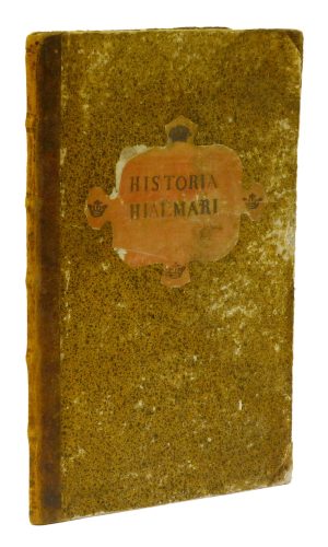 5,000 krHistoria Hialmari regis Biarmlandiæ atque Thulemarkiæ, ex fragmento runici ms.ti literis recentioribus descripta, cum gemini versione Johannis Peringskioldi.(Stockholm, Enaeus (?), 1700 eller 1701.) Folio. (43) s. Tryckt i svart och rött. Något nött samtida hfrbd, ryggen med lätt upphöjda bind, pärmarna med marmorerat papper och frampärmen med röd formklippt titeletikett med fyra präglade kronor. Med Ragnar Dahlbergs namnteckning. Fiske Runic literature s. 31. Warmtholtz 2563. ”Historia Hialmari” är den andra utgåvan av Lucas Halpaps berömda falsarium av en “Hjálmers saga” skriven med runor. Runhandskriften skulle stundenten Halpap ha hittat hos en bonde i Rasbotrakten i Uppland. Den publicerades som en dissertation 1690 under Johannes Bilbergs presidium och väckte stor sensation. Sverige saknade till skillnad mot Danmark runtexter skrivna på annat material än sten. Riksantikvarien Johan Peringskiöld d.ä (1654-1720) blev entusiastisk av det fantastiska fyndet och ombesörjde efter att ha lyckats köpa handskriften denna nya utgåva med runskriften avritad i träsnitt jämte fornnordisk, latinsk och svensk uttolkning. Texten publicerades sedan återigen 1705 av Hickes i dennes stora ”Theasurus Linguarum vett. septentrionalium”. Falsariet avslöjades år 1774 av Carl Gustaf Nordin men den blev ändå fortfarande 1797 översatt till franska av Ch. Pougens i dennes “Essai sur les antiquités du Nord”. Som ansvariga för falsariet har förstås Carl Lundius och kretsen kring Olof Rudbeck pekats ut. -