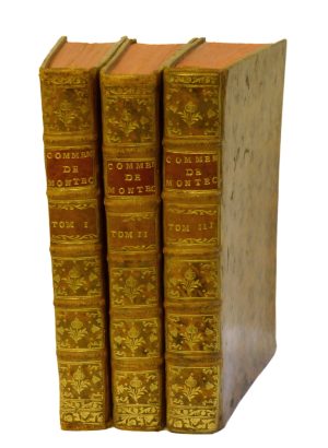 15,000 krCommentaires sur les mémoires de Montecuculi, Généralissime des armées, & Grand-Maître de l’artillerie de l’Empereur; Par monsieur le Comte Turpin De Crissé, Maréchal des Camps & Armées du Roi, inspecteur général de cavalerie & de dragons, des Académies Royales des Sciences & Belle-Lettres de Berlin & de Nancy. 1-3.Paris, Lacombe, 1769. 4to. Engr. front,+ (2),+ XXI,+ (blank),+ 397 pp.+ 17 fold. engr. plates; 438 pp.+ 18 engr. plates, of which 16 folding; 523,+ (3) pp.+ 8 fold. engr. plates. With seven engr. vignettes in text. The plates numbered 1-43. Contemporary mottled calf, richly gilt spines with raised bands and red labels, red edges. Three volumes, the first somewhat worn at top and tail of spine. Owner’s signature of Carl L. Kämpe, dated Paris 1796, and possibly from the library of Kavlås. Jordan 2578. Pohler III, p. 593. Fine copy of the first edition of Turpin de Crissé’s large and illustrated commentaries to Montecuccoli’s ”Mémoires, ou Principes de l'art militaire”. The allegoric frontispice is engraved by Andouard after Casanova. A second edition in 8vo was published in 1770. The Imperial general Raimund Montecuccoli (1609-80) is considered one of the most important 17th century military theoretical authors, as well as a highly succesful general in a numbers of wars and also as a diplomat. His works were published in several editions and translations. The first French edition of ”Mémoires, ou Principes de l'art militaire” was published in 1712. The Italian original ”Memoria delle guerra”was published in 1704. Lancelot Turpin de Crissé (1716-93) also had a military career and served in the French army. Beside this work he also published commentaries to Caesar and Vegeta, and wrote an ”Essai sur l'art de la guerre” (1754). Carl L. Kämpe (1738-1816) var amanuens vid Kungl. Biblioteket och senare kansliråd samt en flitig boksamlare. Han gjorde ett flertal utländska resor i Europa som informator för unga adelsmän och införskaffade under dessa en stor mängd böcker, inte minst i Paris under åren efter franska revolutionen. Han donerade 1815 en stor mängd böcker till Skara Kongl. gymnasii bibliothek och en mindre samling samtidigt till herrgårdsbiblioteket på Kavlås. -