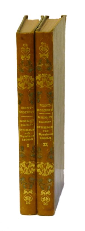3,000 krHistoria öfver kriget emellan Sverige och Ryssland åren 1808 och 1809. Af Gust. Montgomery. 1-2.Örebro, N. M. Lindhs boktryckeri, 1842. 8:o. (2),+ XXVIII,+ 296,+ (1) s.+ 4 utvikbara grav. planscher; (2),+ 310 s.+ 2 utvikbara grav. planscher,+ stor utvikbar grav. karta. Lätta lagerfläckar och enstaka små fläckar. Samtida hfrbd, guld- och oxiderat silverpräglade ryggar, marmorerade pärmpapper och röda stänksnitt. Två volymer. Namnteckning Essén, eventuellt från Kavlås i Västergötland. Setterwall 3767. Gustaf Adolf Montgomery (1791-1861) deltog som fanjunkare och löjtnant i kriget 1808-09, men lämnade det militära redan 1821 för att istället bli författare och politiker. Hans bok om 1808-09-års krig var ett av de första större arbetena om kriget. Den väckte stor uppmärksamhet och översattes bl.a. till franska. Ett antal följdskrifter följde, bl.a. av E. von Vegesack, under vars befäl Montgomery delvis varit. Runeberg, som Montgomery brevväxlade med, hämtade även inspiration till Fänrik Ståls sägner härifrån. -