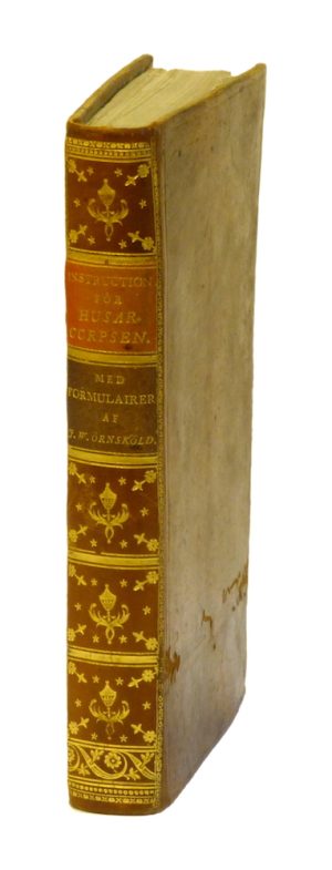 4,000 krInstruction för husar-corpsen af Kongl. Lif-regements-brigaden om tjenstgöringen på rothen. Författad och föreslagen af J. W. Örnsköld. Faststäld och utgifwen år 1803 af Corpsens secund-chef.Örebro, Nils Magnus Lindh, 1803. 8:o. (4),+ 189,+ (15) s. Tillsammanse med: Formulairer hörande till Instruction för husar-corpsen af Kongl. lif-regements-brigaden om tjenstgöringen på rothen. Författad och föreslagen af J. W. Örnsköld. Faststäld och utgifwen år 1803 af Corpsens secund-chef. Örebro, Nils Magnus Lindh, 1803. 8:o. (144) s. varav 16 blad utvikbara. Samtida skinnband, fint guldornerad rygg med röd och blå titeletiketter, förgyllda pärmkanter och med fina blå marmorerade försättsblad. Fint exemplar av denna ovanliga militärinstuktion för det blivande Livregementets husarer. Andra delen består av 54 stycken förlagor till formulärer, flera stora utvikbara varav en mycket stor tryckt i rött och svart. Johan Wilhelm Örnsköld (1760-1817) var militär vid livregementet till häst och blev 1792 major vid livregementets lätta dragonkår samt 1794 överste för armén. Han var även riksdagsman, bl.a. vid riksdagen i Gävle 1792. -