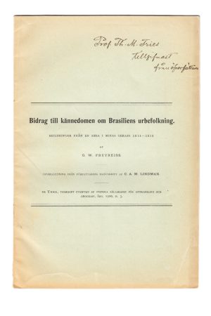 400 krBidrag till kännedomen om Brasiliens urbefolkning. Skildringar från en resa i Minas Gerais 1814-1815 af G. W. Freyreiss. Öfversättning från författarens manuskrift af C. A. M. Lindman. Ur Ymer, årg. 1900, H.3.Stockholm, Central-Tryckeriet, 1900. 8:o. (2),+ 261-279 s. Häftad, med tryckt omslag. Dedikation till Th. M. Fries från översättaren. Georg Wilhelm Freyreiss (1789-1825) var tysk zoolog och som kom till Brasilien 1813. Med ekonomiskt understöd från den svensk-norske konsuln Lorentz Westin (1787–1846) kunde han genomföra resor i det inre av Brasielien och besökte då bland annat Minas Gerais, där han samlade ornitologiska och botaniska exempel till svenska samlingar i Stockholm och Uppsala. Han reste senare även tillsammans med prins Maximilian av Wied-Neuwied till Bahia. År 1818 blev han utnämnd till professor i Zoologi vid universitet i Rio de Janeiro men hann som sådan inte publicera mycket. C. A. M. Lindmans översättning är ett utdrag ur den större handskrift av Freyreiss som finns i Kungliga Vetsnskapsakademien bibliotek. -