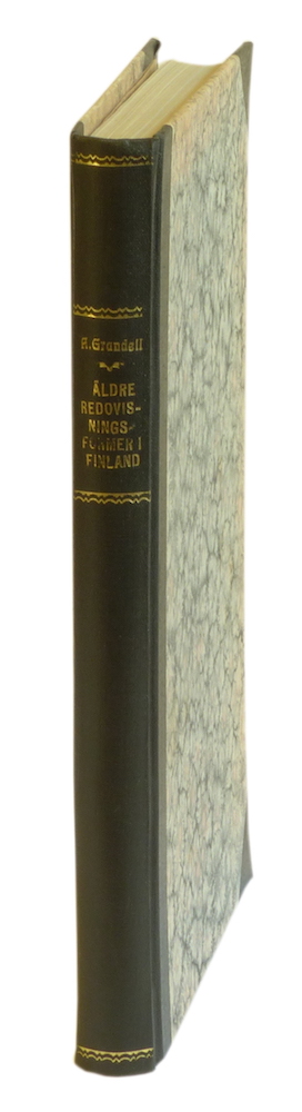 600 krÄldre redovisningsformer i Finland. En undersökning av den företagsekonomiska redovisningens utveckling i Finland intill 1800-talets slut. Ak. avh.Helsingfors, 1944. 8:o. 239 s.+ planscher. Något senare svart hkbd med guldornerad rygg. (Företagsekonomiska forskningsföreningens skriftserie:1.) Ovanlig avhandling om äldre bokföring. Marginalanteckningar i blyerts vid innehållsförteckningen. Avhandlingen ventilerades vid Svenska Handelshögksolan i Helsingfors den 19 december 1944. -