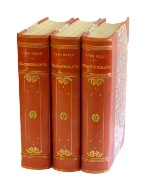 3,000 krTranshimalaya. Upptäckter och äfventyr i Tibet. 1-3.Stockholm, Albert Bonniers förlag, 1909-12. Rikt illustrerad. 8:o. (16),+ 666,+ (2) s.+ 42 planscher,+ utvikbar karta; (4),+ 594,+ (2) s.+ 37 planscher,+ 2 utvikbara kartor; (8),+ 592 s.+ 34 planscher,+ utvikbar karta. Flera planscher utvikbara och kolorerade. Samtida röda halvmarokängband, guldornerade ryggar med tre upphöjda bind och med liten grön deletikett, marmorerade pärmpapper och snitt. Tre volymer. Hess A:7. Fint exemplar av första upplagan av Hedins skildring av sin femte och dittills största resa, åren 1905-08 till Indien och Transhimalaya. Resan dit skildrade han i “Öfver land till Indien”, som utkom 1910. Detta är den reseskildring av Sven Hedin som har översatts till flest språk. -