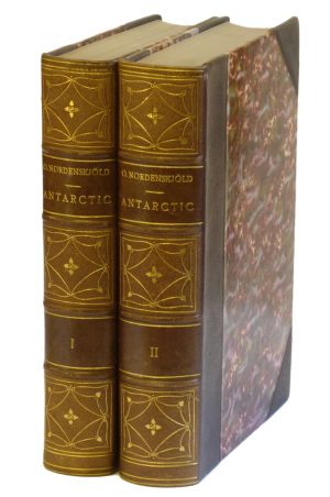 2,000 krAntarctic. Två år bland Sydpolens isar. Med öfver 350 illustrationer (hvaraf närmare 150 helsidesbilder) samt 4 kartor i färgtryck. 1-2.Stockholm, Albert Bonniers förlag, 1904. 8:o. Porträtt,+ (2),+ XXXIV,+ 486,+ (6) s.+ stor utvikbar karta,+ planscher; porträtt,+ (11),+ (blank),+ 552,+ (8) s.+ 3 litogr. kartor, varav två utvikbara,+ planscher, delvis i färg. Mörkbruna halvmarokängband, rikt guldornerade något blekta ryggar med upphöjda bind (G. Hedberg). Två volymer. Hulth 37. Ståtligt exemplar Otto Nordenskjölds klassiska skildring av den stora expeditionen till Antarktis, och som bland annat innehåller J. Gunnar Anderssons berättelse om sin, Duses och Grundens övervintring på Antarktis i en liten hydda. Övriga medförfattare är C. A. Duse och Carl Skottsberg. Illustrationerna är delvis efter fotografier och delvis teckningar, bl.a. av John Bauer. -