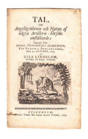 400 krTal, om angelägenheten och nyttan af några artillerie-försöks anställande; hållet för Kongl. Vetenskaps Academien, vid præsidii nedläggande, den 20 october, 1773.Stockholm, i framl. dir Lars Salvii tryckeri, 1774. 8:o. 14 s. Titelbladet med inklistrad grav. vignett och äldre numrering i bläck. Fläckig i kanterna. Tagen ur band. Bläckantekning på sista blanka sidan. Svaret av Wargentin. Nils Lindblom (1725-93) var professor i matematik vid artilleriet och djupt engagerad i akademiens egen framställning av optiskt glas både för glasögon och instrument Han valdes in i KVA 1769. -